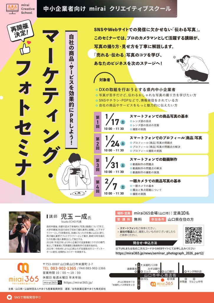 このセミナーでは、プロのカメラマンとして活躍する講師が、写真の撮り方・見せ方を丁寧に解説します。